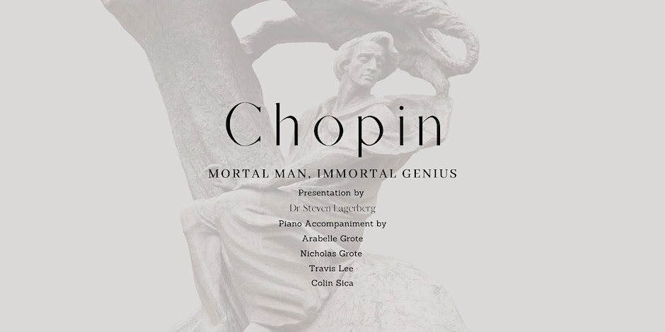 The Polish Cultural Center invites you to the musical lecture “Chopin: Mortal Man, Immortal Genius” by Steven Lagerberg. This is an evening presenting a lecture on life of Frederic Chopin illustrated with his compositions performed by outstanding young pianists from the Pacific Northwest. The narrative will discuss stories behind some of the works and how Chopin’s passions and patriotism as well as his chronic illness inspired and affected his compositions.